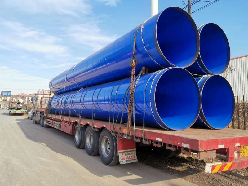 2020年友誠管業為成都大運會北部水廠供貨的涂塑鋼管,就是典型的大口徑涂塑鋼管:基管采用D1420螺旋鋼管,防腐方式為內外環氧粉末涂塑,顏色為藍色。大口徑涂塑鋼管定尺為12米,一輛半掛車可以裝載4D1420大口徑涂塑鋼管。