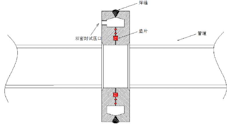 雙密封法蘭打底焊接完成后,首先進行雙密封水壓預試驗,試驗壓力為管道設計壓力,穩壓30秒合格后,排出積水,進行焊縫填充、蓋面,待焊縫焊接完成后,進行雙密封水壓試驗,強度試驗壓力為管道試壓壓力的1.5倍,穩壓30秒,合格后進行嚴密性水壓試驗,試驗壓力為設計壓力,穩壓60秒,試驗合格后,排出法蘭內積水,對試壓口進行焊接封堵,確保封堵質量。