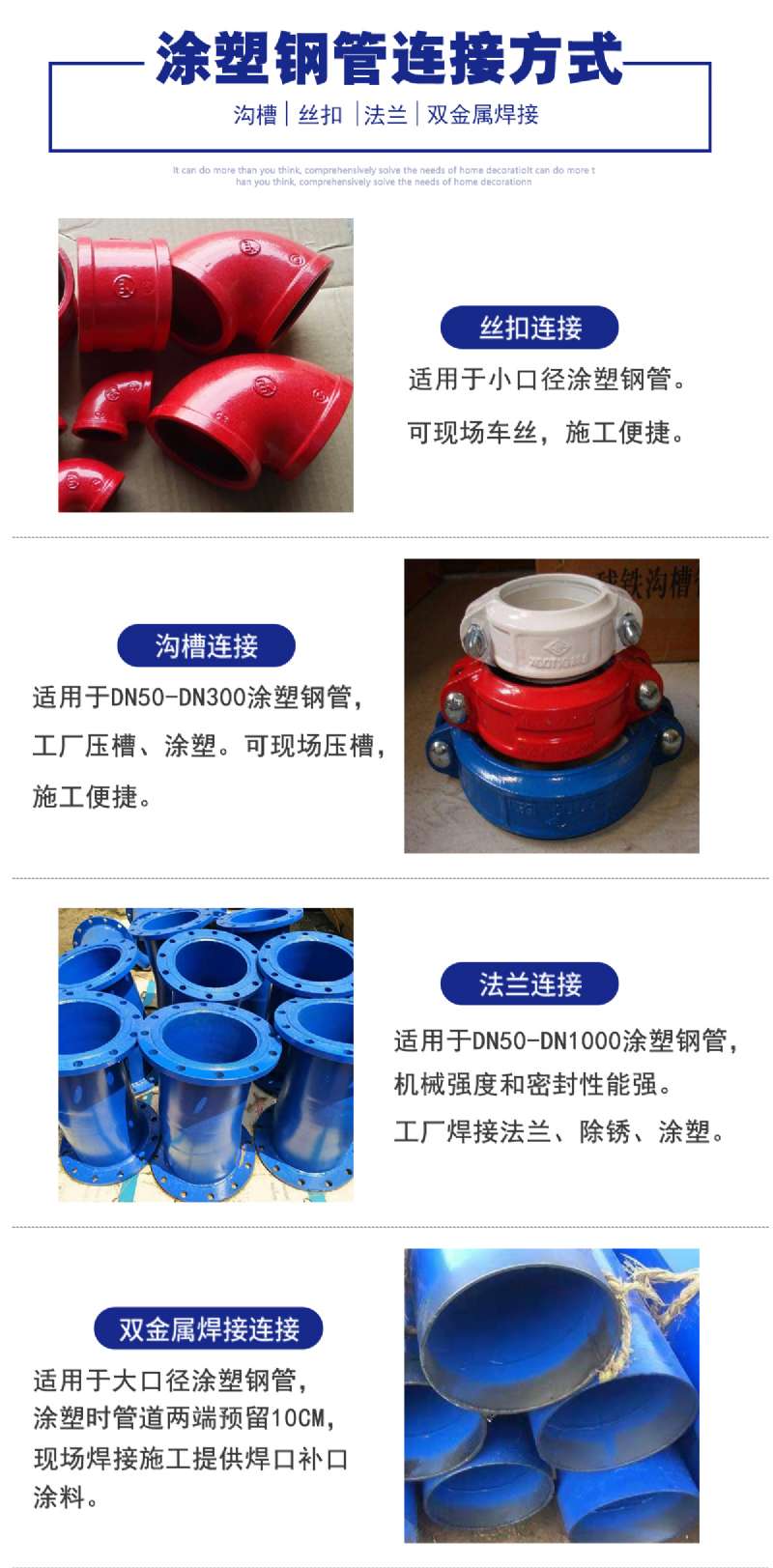 • 涂塑管,又名鋼塑復合管、涂塑復合鋼管,是采用PE(改性聚乙烯)進行熱浸塑或EP(環氧樹脂)進行內外涂覆的產品,具有優良的耐腐蝕性能。同時涂層本身還具有良好的電氣絕緣性,不會產生電蝕。吸水率低,機械強度高,摩擦系數小,能夠達到長期使用的目的。還能有效的防止植物根系及土壤環境應力的破壞等。連接便捷、維修簡便。