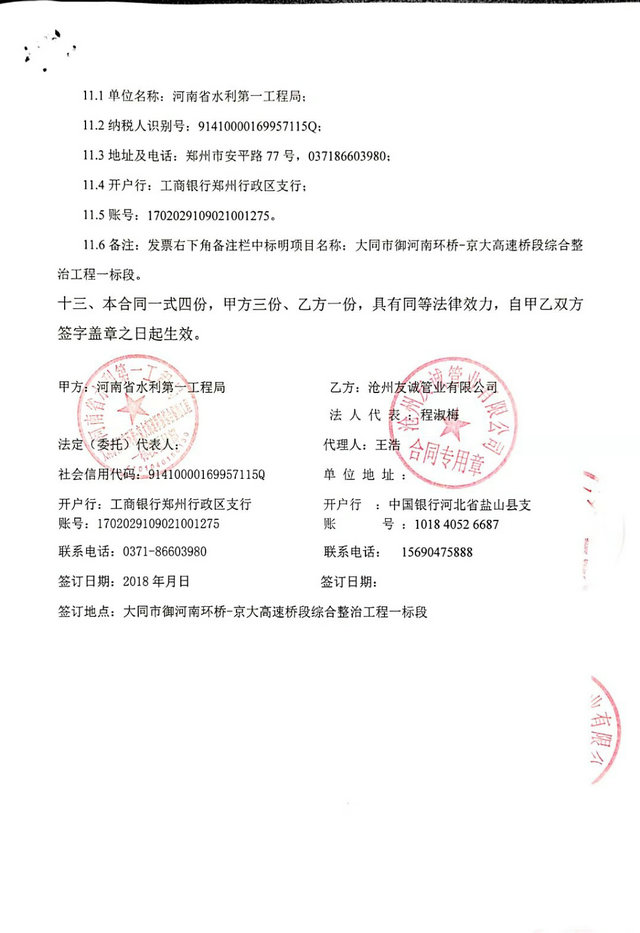 2018年我公司與河南省水利第一工程局合作,簽署大同市御河南環水利項目外PE內EP防腐鋼管采購合同,此工程管道尺寸為DN1200和DN600兩個規格,其鋼管防腐采用了最新型防腐形式-外PE內EP防腐鋼管,防腐蝕強度高,作為地埋鋼管耐酸耐堿強度強度強,能夠順利合作感謝客戶對我們的信任,采購合同如下: